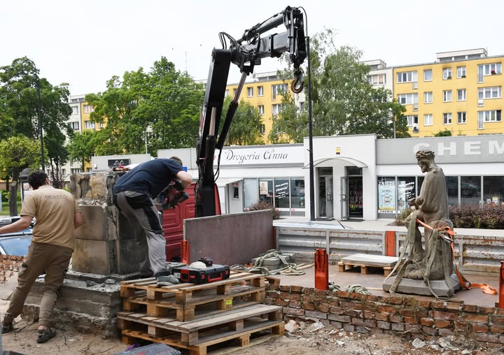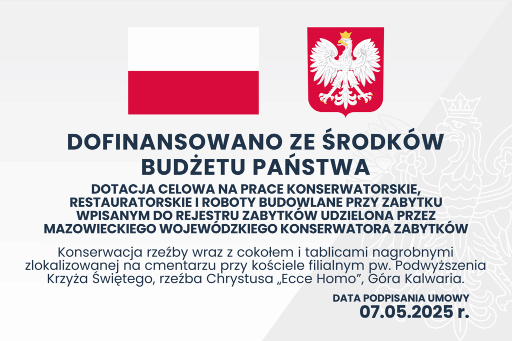 Parafia Rzymskokatolicka Niepokalanego Poczęcia Najświętszej Maryi Panny w Górze Kalwarii przy zaangażowaniu środków własnych oraz dofinansowaniu udzielonemu przez Mazowieckiego Wojewódzkiego Konserwatora Zabytków realizuje zadanie pn. „Konserwacja rzeźby wraz z cokołem i tablicami nagrobnymi, zlokalizowanej na cmentarzu przy kościele filialnym pw. Podwyższenia Krzyża Świętego, rzeźba Chrystusa Ecce Homo, Góra Kalwaria”. Dnia 5.06.20205 r. nastąpił demontaż obiektu. Stan zachowania zły, z licznymi ubytkami formy, spękania, szczeliny, złuszczenia, szare i ciemnoszare nawarstwienia, nawarstwienia biologiczne w postaci kolonii glonów. Powierzchniowo występują liczne spękania, biegnące równolegle, wzdłuż ciała. W polach inskrypcji odpryski i osypywanie się warstwy powierzchniowej.