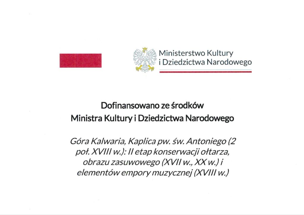 Parafia Niepokalanego Poczęcia Najświętszej Maryi Panny w Górze Kalwarii od dnia 29.07.2025 roku do 30.11.2025 roku realizuje zadanie pn: Góra Kalwaria, Kaplica pw. św. Antoniego (2 poł. XVIII w.): II etap konserwacji ołtarza, obrazu zasuwowego (XVII w., XX w.) i elementów empory muzycznej (XVIII w.).