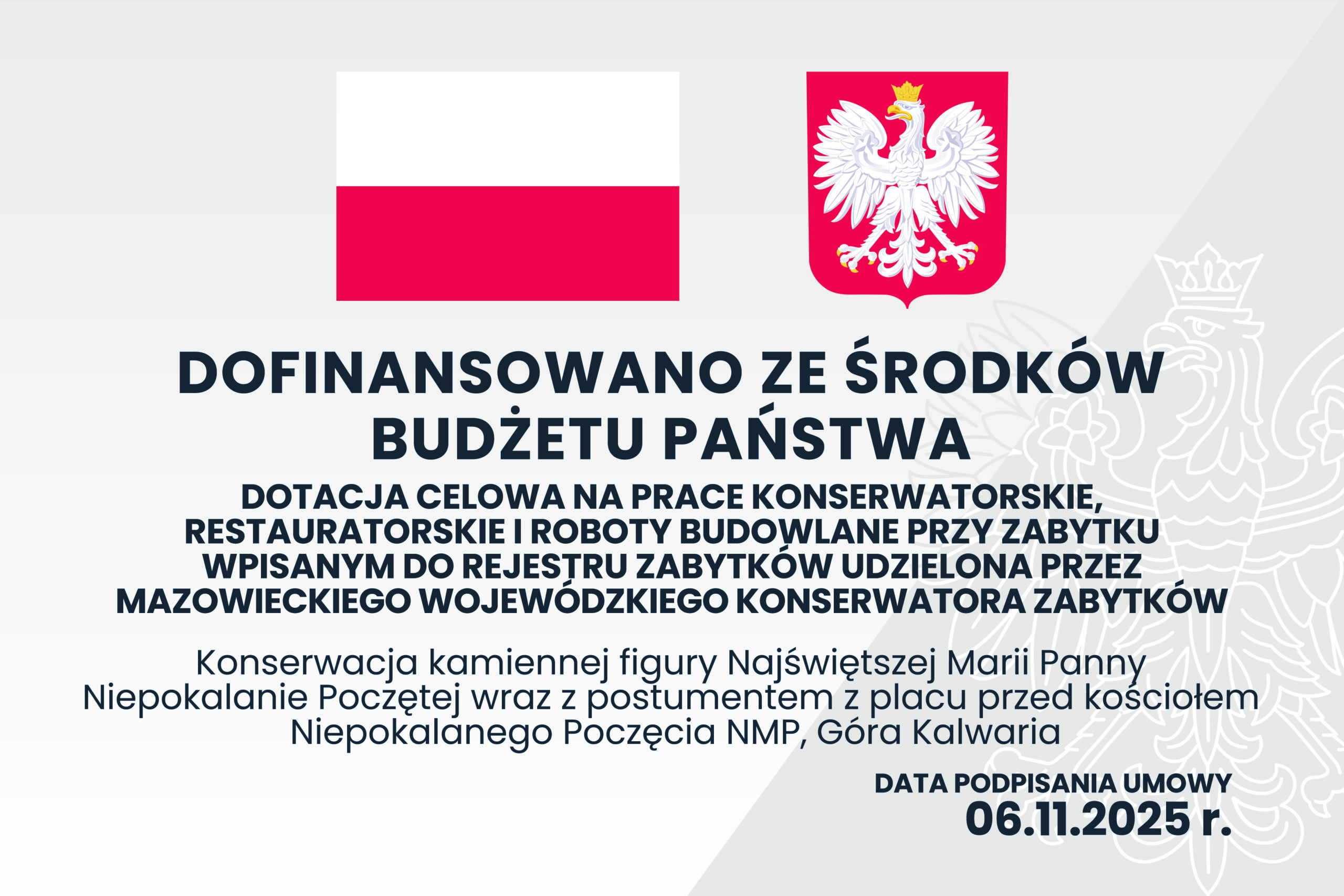 Parafia Niepokalanego Poczęcia Najświętszej Maryi Panny w Górze Kalwarii w terminie od 12.07.2024r. do 07.11.2024 r. zrealizowała w całości zadanie polegające na konserwacji kamiennej figury Najświętszej Maryi Panny Niepokalanie Poczętej wraz z postumentem z placu przed kościołem Parafialnym. Figura Immaculaty wykonana z wapienia została ufundowana przez mieszkańców Góry Kalwarii w roku 1894 jako dziękczynienie za...Continue Reading